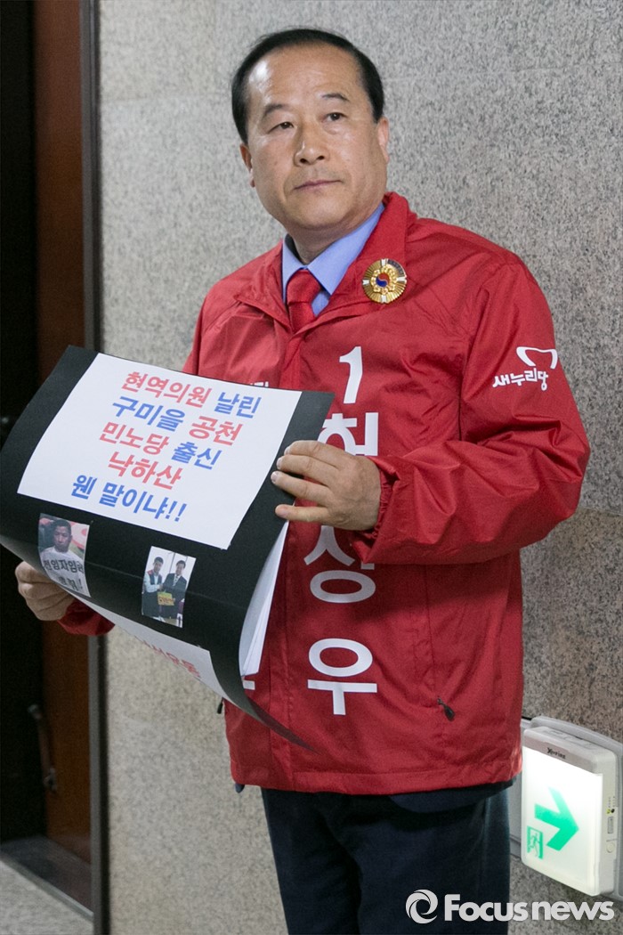 (서울=포커스뉴스) 허성우 새누리당 예비후보가 7일 오전 서울 여의도 국회 새누리당 대표최고위원실 앞에서 구미을 공천 탈락과 관련해 피켓 시위를 하고 있다.