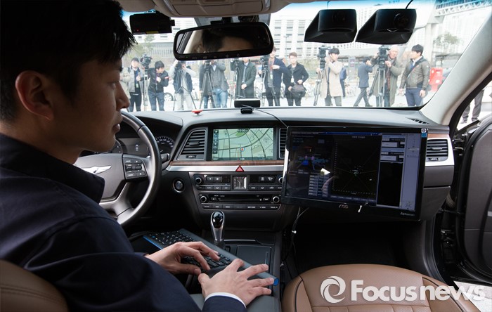 (세종=포커스뉴스) 7일 오전 세종시 정부세종청사 국토교통부 앞에서제1호 자율주행차 시험운행 허가 및 시연이 열린 가운데 현대 제네시스가 국내 자율주행차 임시운행 제1호차로 허가받고 도로주행을 시작했다. 현대자동차 관계자가 시스템을 점검하고 있다.