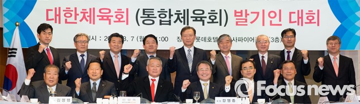 (서울=포커스뉴스) 7일 서울 중구 롯데호텔앤리조트 서울에서 열린 '대한체육회(통합체육회) 발기인 대회'에서 김정행(앞줄 왼쪽 두번째부터) 대한체육회장, 안양옥 통합준비위원장, 강영중 국민생활체육회장을 비롯한 참석자들이 파이팅 포즈를 취하고 있다.