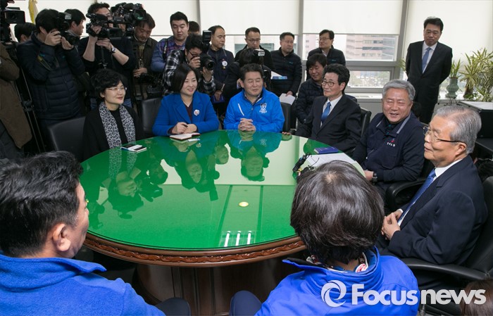 (서울=포커스뉴스) 김종인(왼쪽 여섯번째) 더불어민주당 비대위 대표가 7일 오후 서울 영등포구 한국노동조합총연맹을 방문해 김동만(왼쪽 다섯번째) 위원장과 대화하고 있다.