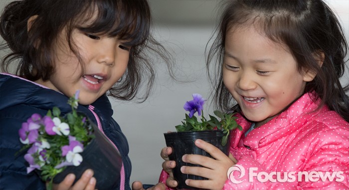 (세종=포커스뉴스) 7일 오후 세종시 정부세종청사 농림축산식품부 앞 다솜동산에서 어린이가 팬지의 향기를 맡고 있다.