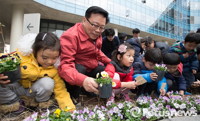 (세종=포커스뉴스) 7일 오후 세종시 정부세종청사 농림축산식품부 앞 다솜동산에서 이동필 농림축산식품부장관이 어린이들과 튤립 및 백합의 구근과 팬지를 심고 있다.
