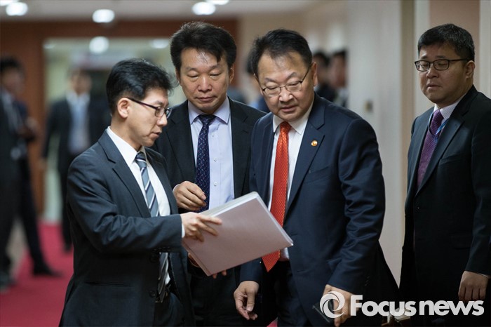 (서울=포커스뉴스) 유일호(오른쪽) 경제부총리가8일 오전 서울 세종로 정부서울청사에서 열린 국무회의에 입장하기 전 회의자료를 보고 있다. 2016-03-08
