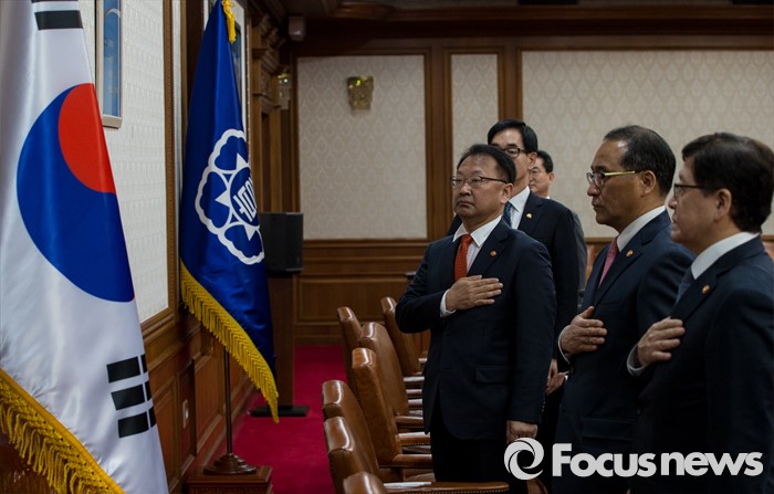 (서울=포커스뉴스) 8일 오전 서울 종로구 정부서울청사에서 열린 국무회의에서 유일호(맨 왼쪽) 경제부총리 겸 기회재정부 장관을 비롯한 국무위원들이 국민의례를 하고 있다.