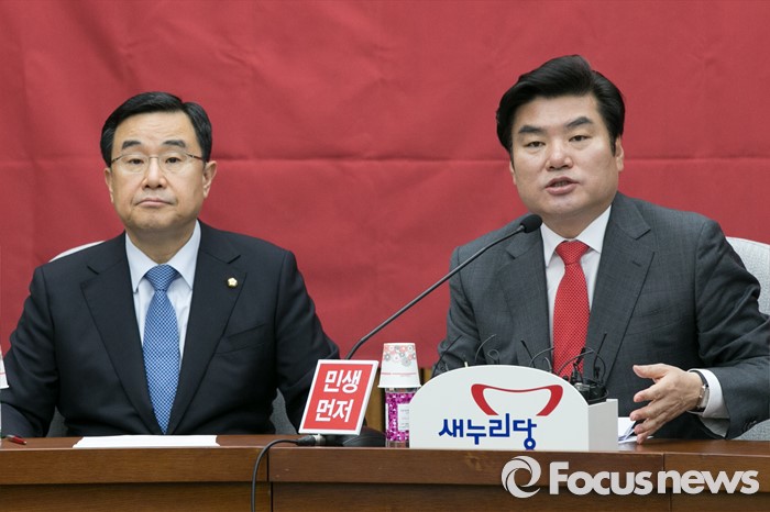 (서울=포커스뉴스) 원유철(오른쪽) 새누리당 원내대표가 8일 오전 서울 여의도 국회에서 열린 원내대책회의에 참석해 모두발언하는 동안, 김정훈 정책위의장이 경청하고 있다.
