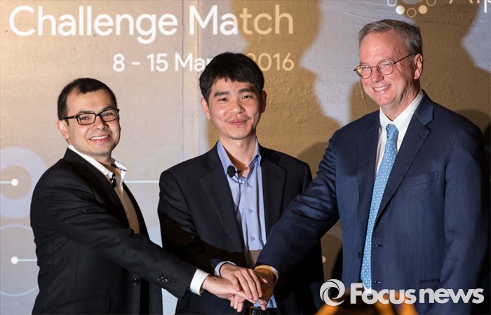 (서울=포커스뉴스) 8일 오전 서울 종로구 새문안로 포시즌스호텔에서 열린 '구글 딥마인드 챌린지 매치' 내ㆍ외신 합동 기자회견에 참석한 데미스 하사비스(왼쪽부터) 구글 딥마인드 최고경영자, 이세돌 9단, 에릭 슈미트 구글 회장이 포즈를 취하고 있다.