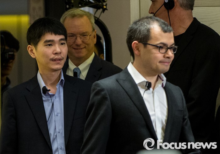 (서울=포커스뉴스) 8일 오전 서울 종로구 새문안로 포시즌스호텔에서 열린 '구글 딥마인드 챌린지 매치' 내ㆍ외신 합동 기자회견에 이세돌 9단(왼쪽부터), 에릭 슈미트 구글 회장, 데미스 하사비스 구글 딥마인드 최고경영자가 입장하고 있다.