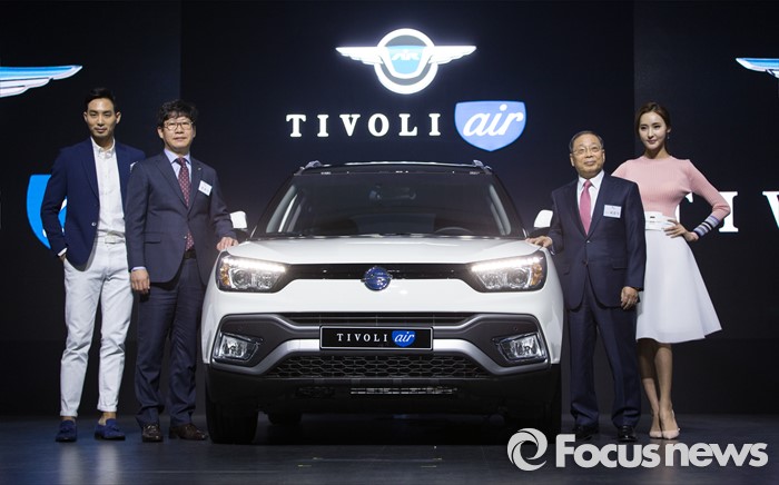 (서울=포커스뉴스) 8일 오전 서울 서초구 세빛섬에서 최종식(오른쪽 두번째) 쌍용자동차 대표이사와 홍봉석(왼쪽 두번째) 쌍용자동차 노조위원장이 티볼리 에어 신차발표회에 참석해 기념촬영을 하고 있다.