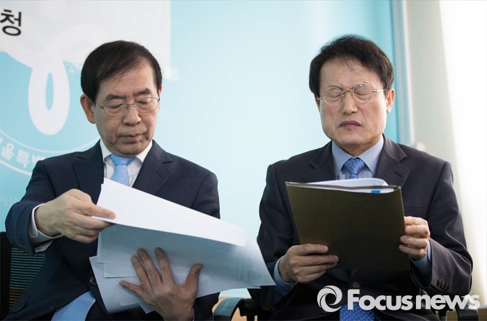 (서울=포커스뉴스) 박원순(왼쪽) 서울시장과 조희연 서울시교육감이 8일 오전 종로구 서울시교육청에서 열린 '서울시-교육청 교육협력사업 기자회견'에 참석해 자료를 보고 있다.