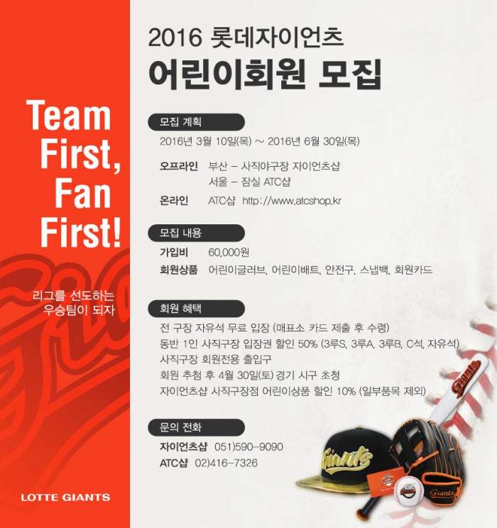 롯데 2016시즌 어린이회원은 어린이 글러브, 어린이 배트, 안전구, 스냅백, 회원카드 등을 선물받는다. 회원카드로 올시즌 자유석 무료입장, 동반 1인 사직구장 입장권 50% 할인, 사직구장 자이언츠샵 어린이상품 구입시 10% 할인, 이벤트 참여 기회 우선 제공 등의 혜택을 받는다. 오는 10일부터 6월30일까지 사직구장 자이언츠샵, 서울 잠실 ATC샵, 온라인 ATC삽 등에서 가입할 수 있다. 가입비는 6만원이다.프로야구 롯데가 2016 어린이회원을 모집한다. 사진은 어린이회원 모집 포스터. <사진제공=롯데 자이언츠>
