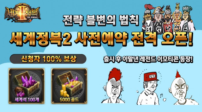 이번 사전예약 이벤트는 '카카오게임 사전예약 페이지'에서 신청할 수 있으며 예약을 마친 유저들은 '세계석'(캐시 보석 아이템) 100개와 5000 골드 등 유용한 아이템들을 받을 수 있다. 또한 세계정복2의 사전예약 이벤트를 기념해 인기 웹툰 작가 이말년이 직접 그린 '이말년 레전드 이모티콘'을 지급한다.
