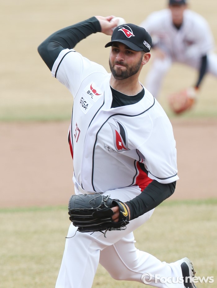 (수원=포커스뉴스) 8일 수원 kt위즈파크에서 열린 2016 KBO리그 시범경기 두산-kt 경기에서 1회말 kt 선발투수 밴와트가 두산 정수빈을 상대로 공을 던지고 있다.