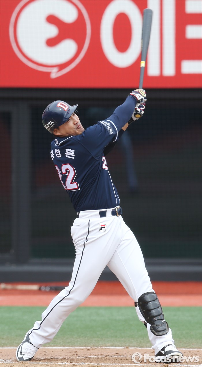 (수원=포커스뉴스) 8일 수원 kt위즈파크에서 열린 2016 KBO리그 시범경기 두산-kt 경기에서 6회초 1사1루에서 두산 홍성흔이 우중월 홈런을 날리고 있다.
