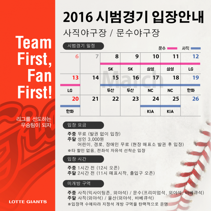 주말 시범경기 울산 문수구장 외야석과 바베큐석, 부산 사직구장 외야석은 개방되지 않는다. 입장권은 경기 당일 오전 11시부터 현장매표소에서만 구매할 수 있다. 주중경기는 무료다.프로야구 롯데 2016 시범경기 입장안내. 주중경기는 무료입장이며 주말경기만 성인에 한해 3000원의 입장료를 받는다. <사진제공=롯데 자이언츠>