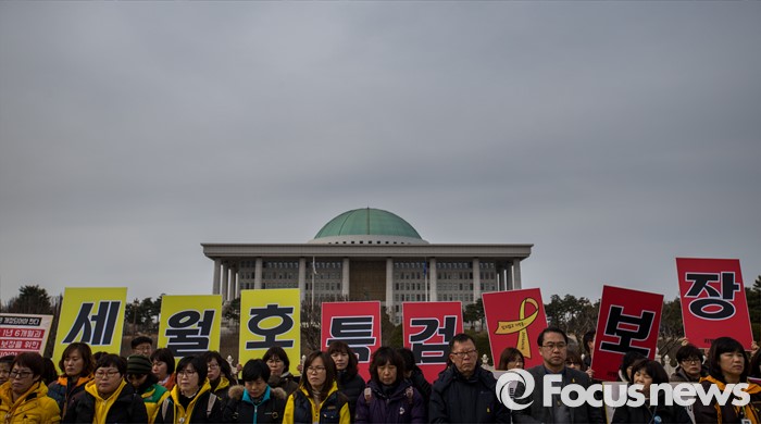 (서울=포커스뉴스) 8일 오후 서울 영등포구 국회 앞에서 열린 '19대 국회 세월호 특별법 개정안 특검 처리 촉구 기자회견'에 참석한 4.16가족협의회 및 관련 시민단체 관계자들이 정부에 세월호 참사 특검처리 약속 이행을 촉구 하고 있다.