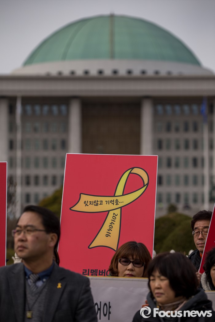 (서울=포커스뉴스) 8일 오후 서울 영등포구 국회 앞에서 열린 '19대 국회 세월호 특별법 개정안 특검 처리 촉구 기자회견'에 참석한 4.16가족협의회 및 관련 시민단체 관계자들이 정부에 세월호 참사 특검처리 약속 이행을 촉구 하고 있다.