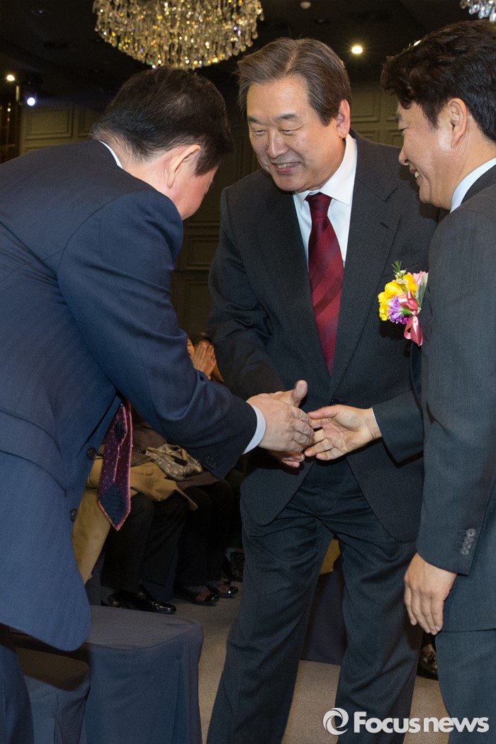 (서울=포커스뉴스) 김무성(가운데) 새누리당 대표와 최경환 새누리당 의원이 8일 오후 서울 마포구 신촌 케이터틀 컨벤션홀에서 열린 새누리당 서울시당 서대문갑 당원교육 및 전진대회에 참석해 악수하고 있다.