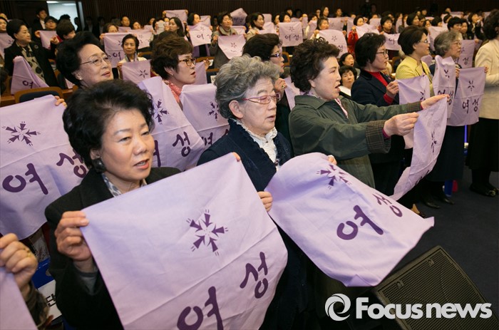 (서울=포커스뉴스) 8일 오후 서울 여의도 국회 헌정기념관에서 열린 세계 여성의 날 기념대회에 참석한 여성들이 퍼포먼스를 하고 있다.