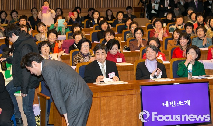 (서울=포커스뉴스) 8일 오후 서울 여의도 국회 헌정기념관에서 열린 세계 여성의 날 기념대회에 참석한 원유철 새누리당 원내대표가 내빈소개에 일어나 인사하고 있다. 왼쪽부터 원 원내대표, 이종걸 더불어민주당 원내대표, 안철수 국민의당 상임공동대표, 심상정 정의당 상임대표.