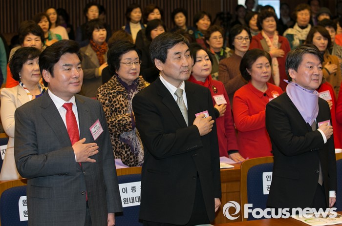 (서울=포커스뉴스) 8일 오후 서울 여의도 국회 헌정기념관에서 열린 세계 여성의 날 기념대회에 참석한 원유철(앞줄 왼쪽부터) 새누리당 원내대표, 이종걸 더불어민주당 원내대표, 안철수 국민의당 상임공동대표 등 참석자들이 국기에 대한 경례를 하고 있다.