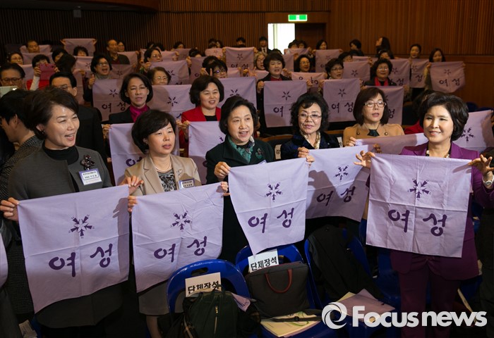 (서울=포커스뉴스) 8일 오후 서울 여의도 국회 헌정기념관에서 열린 세계 여성의 날 기념대회에 참석한 여성들이 퍼포먼스를 하고 있다.