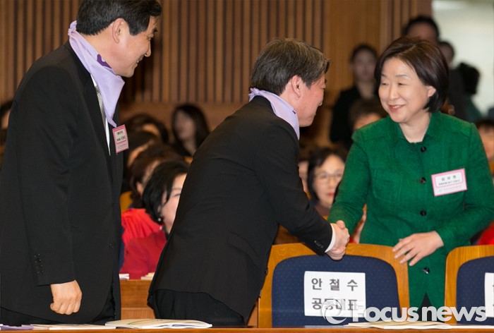 (서울=포커스뉴스) 8일 오후 서울 여의도 국회 헌정기념관에서 열린 세계 여성의 날 기념대회에 참석한 안철수(가운데) 국민의당 상임공동대표가 축사를 마친 뒤 심상정(오른쪽) 정의당 상임대표와 악수하고 있다. 왼쪽은 이종걸 더불어민주당 원내대표.