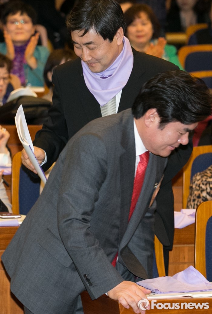 (서울=포커스뉴스) 8일 오후 서울 여의도 국회 헌정기념관에서 열린 세계 여성의 날 기념대회에 참석한 원유철(아래) 새누리당 원내대표와 이종걸 더불어민주당 원내대표가 각각 자리로 이동하고 있다.