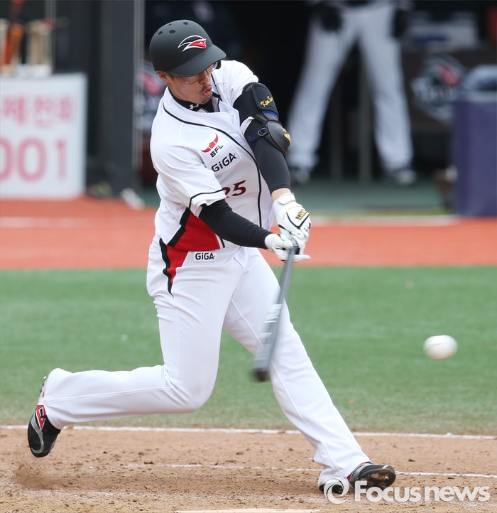 (수원=포커스뉴스) 8일 수원 kt위즈파크에서 열린 2016 KBO리그 시범경기 두산-kt 경기에서 9회 kt 김사연이 타격하고 있다.