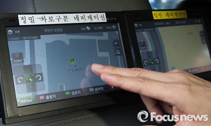 (청주=포커스뉴스) 강호인 국토교통부 장관이 8일 오후 청주시 청원구 오창읍 충북테크노파크에서 열린 차세대 도로교통용 정밀위성항법(GPS) 시연회에서 정밀차로구분 네비게이션을 살피고 있다.