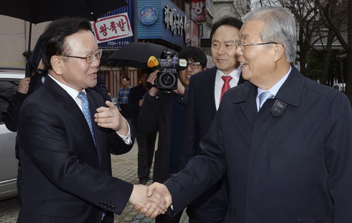 (서울=포커스뉴스) 8일 오전 대구 동구 더불어민주당 대구시당을 방문한 김종인(오른쪽) 비대위 대표와김부겸 수성갑 예비후보가 인사하고 있다. <사진제공=더불어민주당>