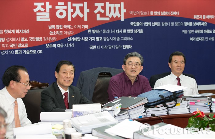 당내 중진의원 물갈이설이 지속적으로 제기되는 상황에서 또다른 중진 의원들이 컷오프 될 지 귀추가 주목된다.8일 오후 서울 여의도 새누리당사에서 열린 20대 총선 분구·통합·경계조정 지역구 공천신청자 면접에 이한구 공천관리위원장이 예비후보들에게 질문하고 있다. 왼쪽부터 김회선 위원, 황진하 부위원장, 이 위원장, 홍문표 위원. 2016.03.08 박동욱 기자