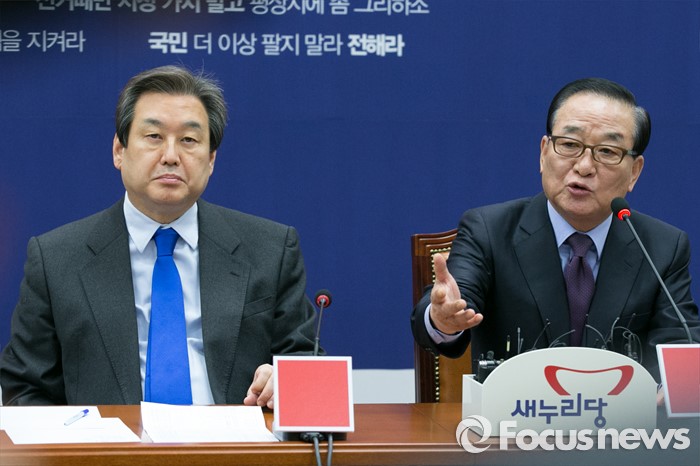 (서울=포커스뉴스) 서청원(오른쪽) 새누리당 최고위원이 9일 오전 서울 여의도 국회에서 열린 최고중진연석회의에 참석해 발언하는 동안, 김무성 대표가 경청하고 있다.