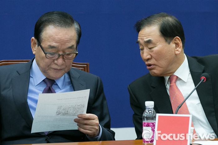 (서울=포커스뉴스) 서청원(왼쪽) 새누리당 최고위원과 이재오 의원이 9일 오전 서울 여의도 국회에서 열린 최고중진연석회의에 참석해, '윤상현 의원 막말' 기사를 보며 대화하고있다.