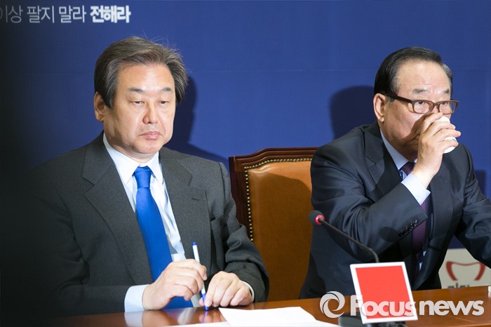(서울=포커스뉴스) 김무성(왼쪽) 새누리당 대표가 9일 오전 서울 여의도 국회에서 열린 최고중진연석회의에 참석해 생각에 잠겨 있는 동안, 서청원 최고위원이 물을 마시고 있다.