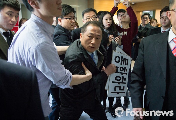 | △ "야권 통합하라!" 외치다 쫓겨나는 시위자 |