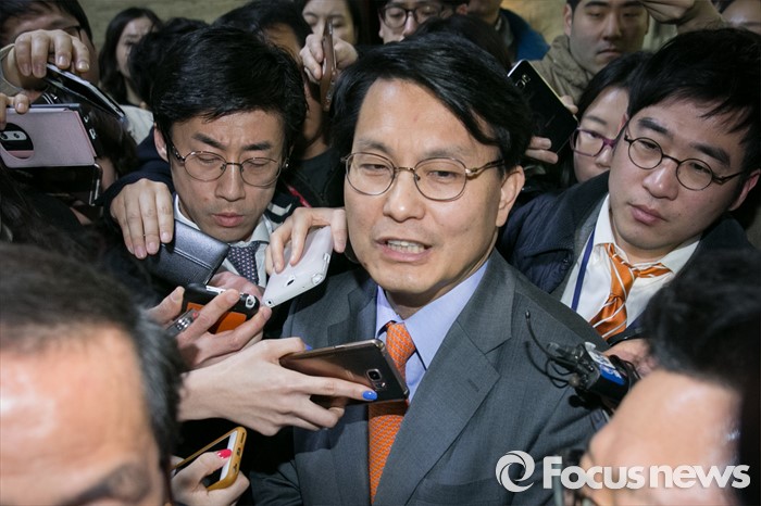 (서울=포커스뉴스) 김무성 새누리당 대표를 향한 욕설로 당내 파문을 일으킨 윤상현 의원이 9일 오전 서울 여의도 새누리당 대표최고위원실 앞 로비에서 기자들의 질문에 답변하고 있다. 전날 윤 의원은 전화를 통해 김 대표를 거론하며 욕설한 사실이 언론에 공개됐으며, 이날 김 대표에게 면담을 요청했으나 거절됐다.