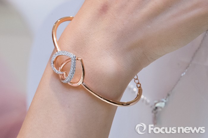 (서울=포커스뉴스) 9일 오전 중구 롯데백화점 본점에서 스와로브스키(SWAROVSKI)의 '화이트데이 컬렉션' 중 디어 뱅글을 모델이 선보이고 있다. 제품은 디어(Dear) 네크리스와 뱅글, 블로우(Blow) 이어링, 데이타임(Daytime) 워치로 구성되어 있다.