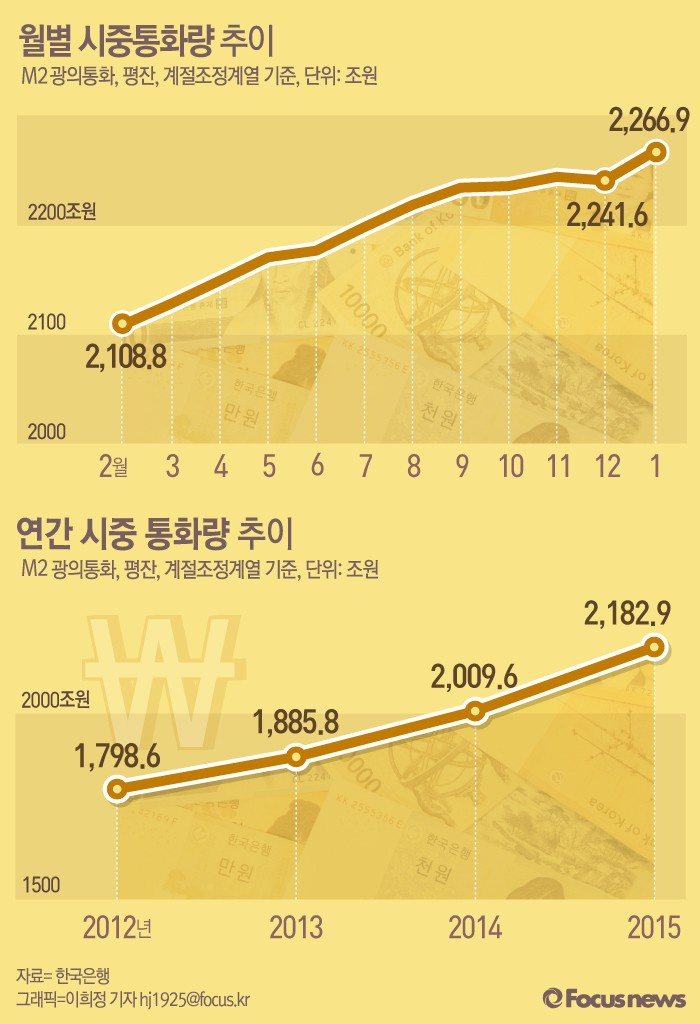 (서울=포커스뉴스) 9일 한국은행이 발표한 '2016년 1월 중 통화 및 유동성'에 따르면 올해 1월 시중통화량(M2·광의통화)은 2266조9000억원(평잔·원계열 기준)으로 전년 동월대비 8.1%, 전월 대비 1.1% 늘었다.
