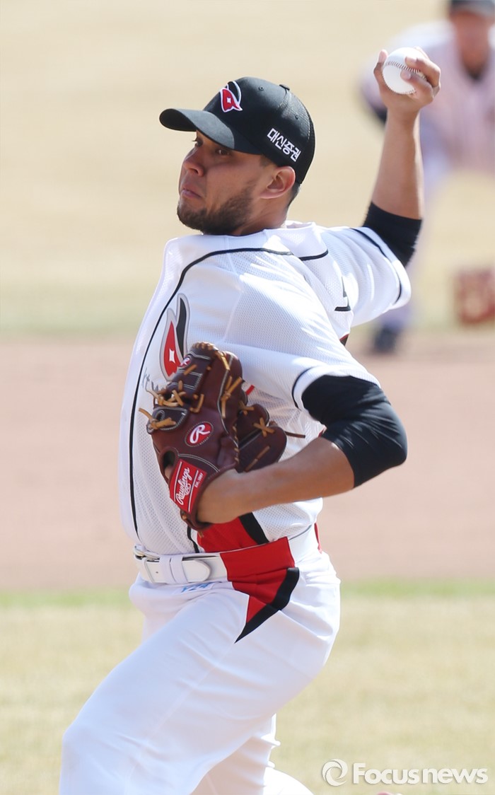 (수원=포커스뉴스) 9일 수원 kt위즈파크에서 열린 2016 KBO리그 시범경기 두산-kt 경기에서 1회초 kt 새 외국인 투수 피노가 투구하고 있다.