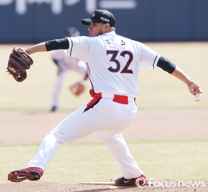 (수원=포커스뉴스) 9일 수원 kt위즈파크에서 열린 2016 KBO리그 시범경기 두산-kt 경기에서 1회초 kt 새 외국인 투수 피노가 투구하고 있다.