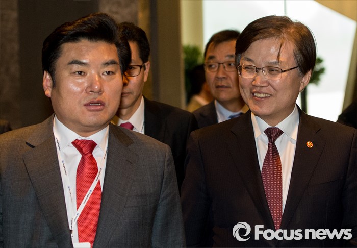 화서울=포커스뉴스) 9일 오후 서울 종로구 포시즌스 호텔에서 열린 이세돌 9단과 알파고의 '구글 딥마인드 챌린지 매치'에 참석한 원유철(왼쪽) 새누리당 원내대표와 최양희 미래창조과학부 장관이 대화하고 있다.