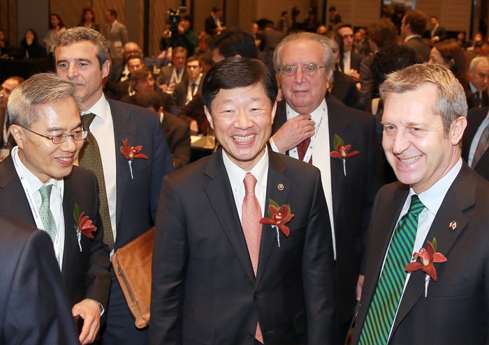 (서울=포커스뉴스) 우태희 산업통상자원부 2차관이 9일 오전 서울 종로구 포시즌호텔 그랜드볼룸에서 열린 한-이탈리아 비즈니스 포럼에서 참석자와 환담을 나누고 있다. <사진제공=산업통상자원부>