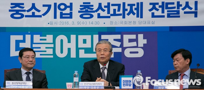 (서울=포커스뉴스) 김종인 더불어민주당 비대위 대표가 9일 오후 서울 여의도 국회에서 열린 중소기업중앙회 회장단 총선과제 전달식에 참석해 인사말을 하고 있다. 왼쪽부터 이용섭 총선정책공약단장, 김 대표, 박성택 중소기업중앙회장.