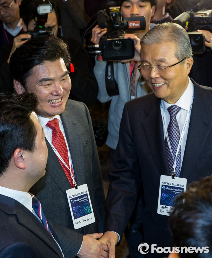 (서울=포커스뉴스) 9일 오후 서울 종로구 포시즌스 호텔에서 열린 이세돌 9단과 알파고의 '구글 딥마인드 챌린지 매치'에 참석한 원유철(왼쪽) 새누리당 원내대표와 김종인 더불어민주당 비상대책위원회 대표가 악수하고 있다.