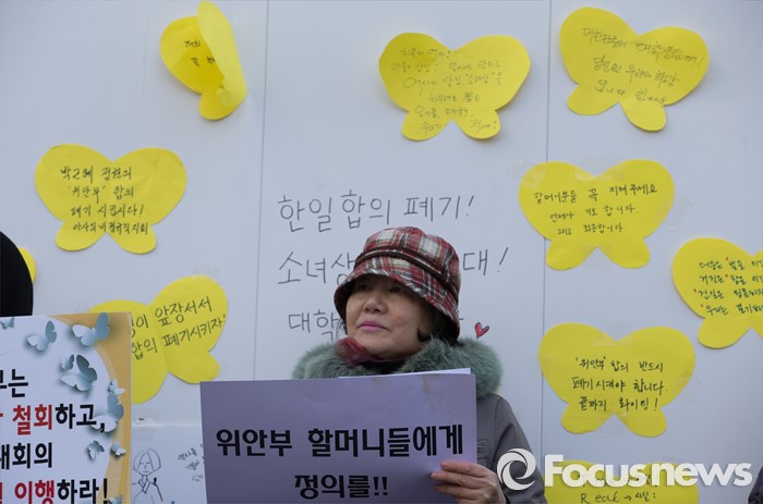한국정신대문제대책협의회는 이날 낮 12시 옛 주한일본대사관 앞 평화로에서 제1221차 정기 수요시위를 열고 위안부 피해자 당사자의 요구를 배제한 한국과 일본 양국 정부의 합의에 대해 '무효'를 주장했다.