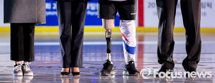 (춘천=포커스뉴스) 9일 오후 강원 춘천의암빙상장에서 제2회 2018 평창 패럴림픽 데이에 참석해 패럴림픽 홍보대사로 위촉된 아이스슬레지하키 선수 정승환(오른쪽 두번째)이 기념촬영을 하고 있다.