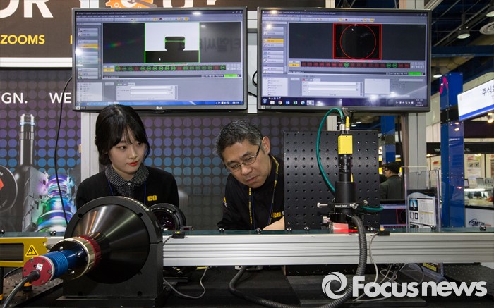 (서울=포커스뉴스) 9일 오후 서울 강남구 코엑스에서 열린 '오토메이션 월드 2016’ 에드몬드옵틱스 부스에서 관계자들이 텔레센트릭 렌즈(왼쪽)와 하이퍼센트릭 렌즈(오른쪽)를 이용한 제품 검수를 시연하고 있다.
