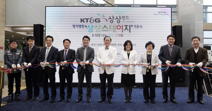 KT&G는 9일 경기 일산 명지병원 로비에서 김형수 명지병원장과 김진한 KT&G 사회공헌실장 등이 참석한 가운데 'KT&G 상상펀드와 함께하는 상상스테이지 기증식'을 가졌다. 기증식 이후엔 뮤지션 '자전거 탄 풍경'의 축하공연도 펼쳐졌다.