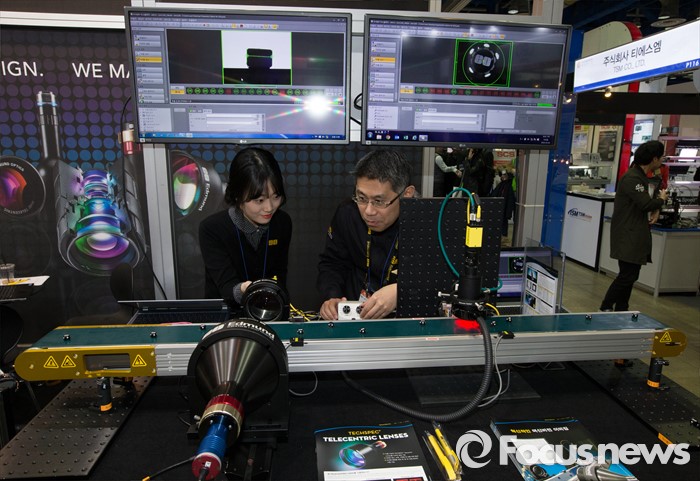 (서울=포커스뉴스) 9일 오후 서울 강남구 코엑스에서 열린 '오토메이션 월드 2016’ 에드몬드옵틱스 부스에서 관계자들이 텔레센트릭 렌즈(왼쪽)와 하이퍼센트릭 렌즈(오른쪽)를 이용한 제품 검수를 시연하고 있다.