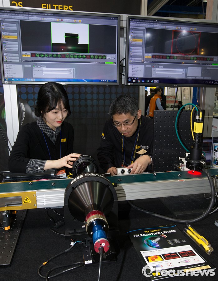 (서울=포커스뉴스) 9일 오후 서울 강남구 코엑스에서 열린 '오토메이션 월드 2016’ 에드몬드옵틱스 부스에서 관계자들이 텔레센트릭 렌즈(왼쪽)와 하이퍼센트릭 렌즈(오른쪽)를 이용한 제품 검수를 시연하고 있다.
